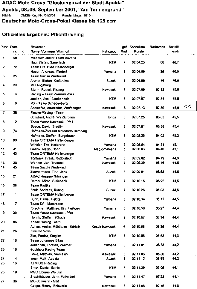 26. 50 Janssen Racing Team Birkner, Martin 16515 Oranienburg Honda 38. DMV MotoCross Altmersleben 12.08.01